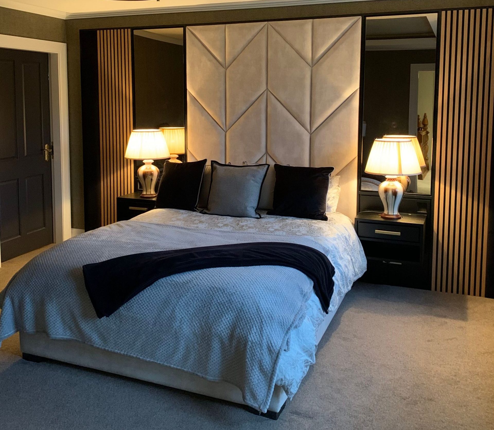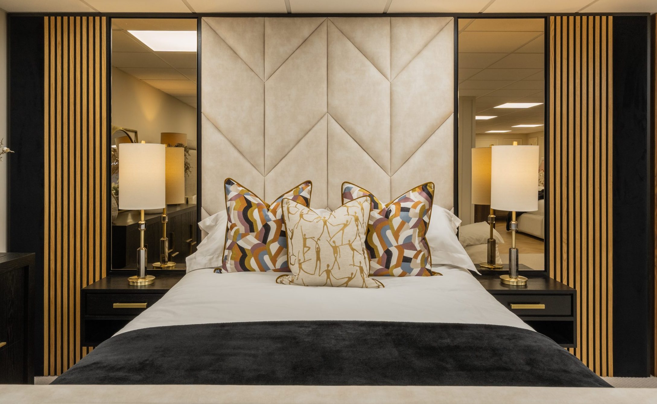 Its elegant design features a beautifully upholstered central headboard framed by optional smoked mirrors and striking oak panelling on either side, creating a sophisticated and contemporary look.