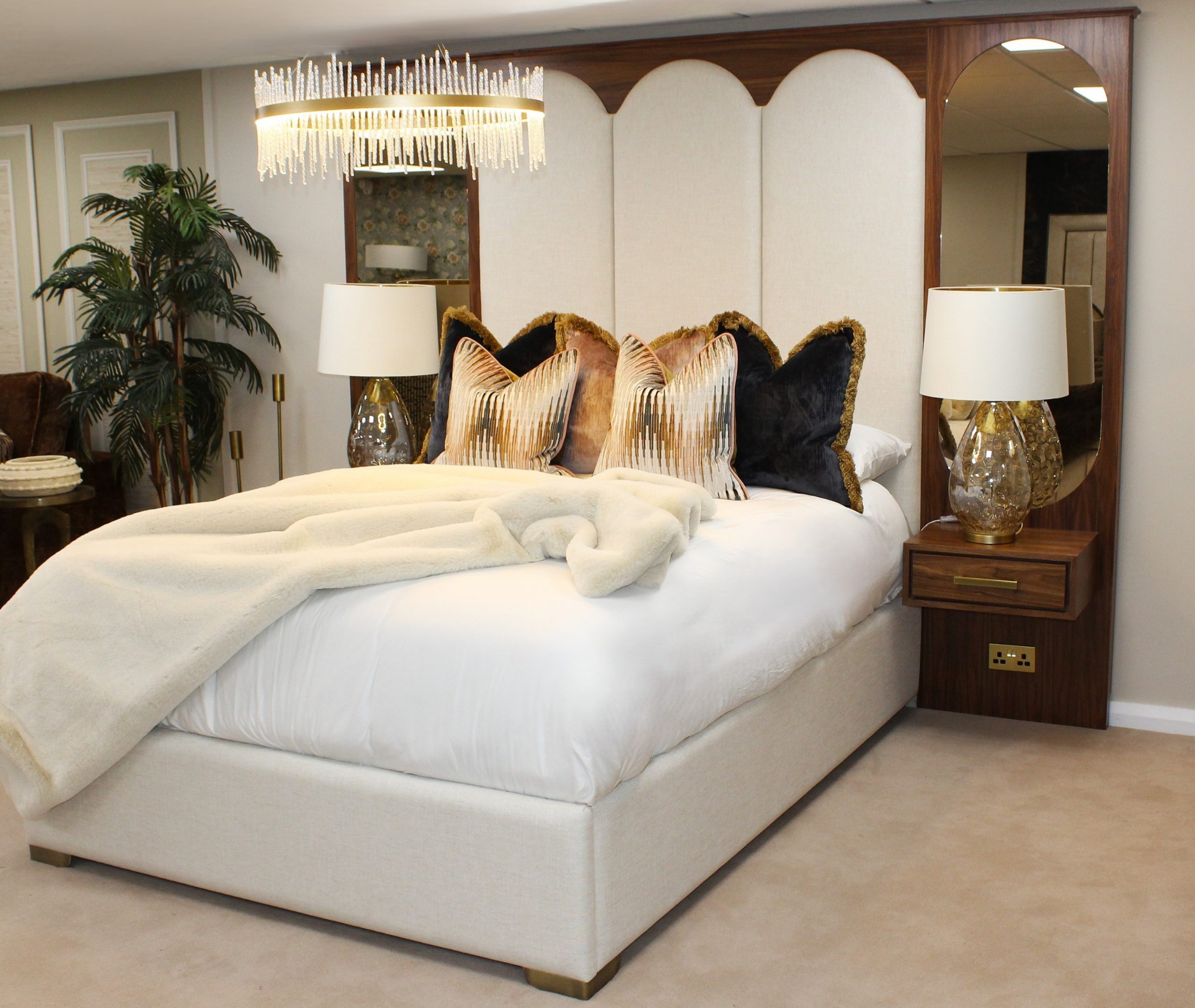 The soft curves of the mirrors and the flowing headboard design work together to create a gentle, calming aesthetic with a natural, refined feel.