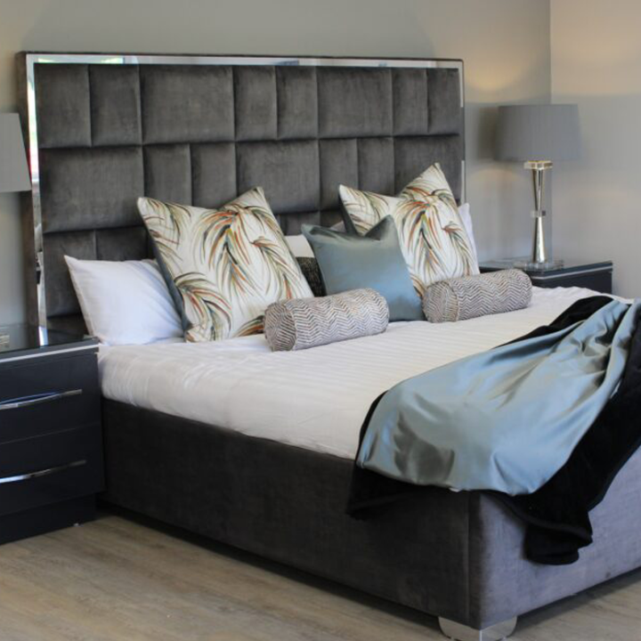 This upholstered bed frame features individual upholstered segments integrated into a beautiful design with a mirrored trim border which is available in a choice of finish.